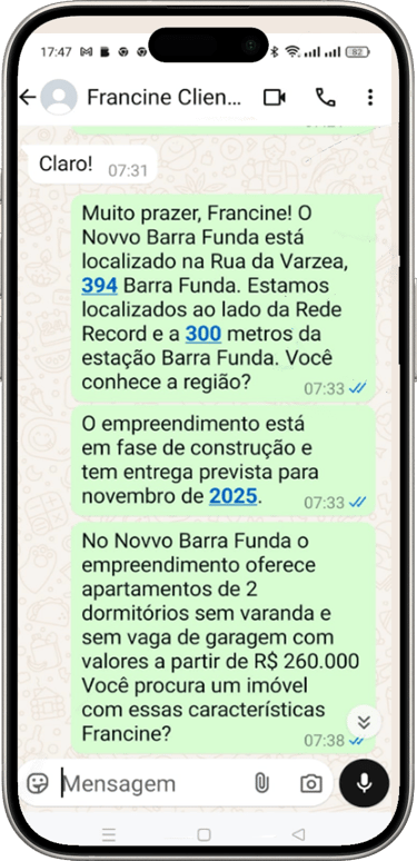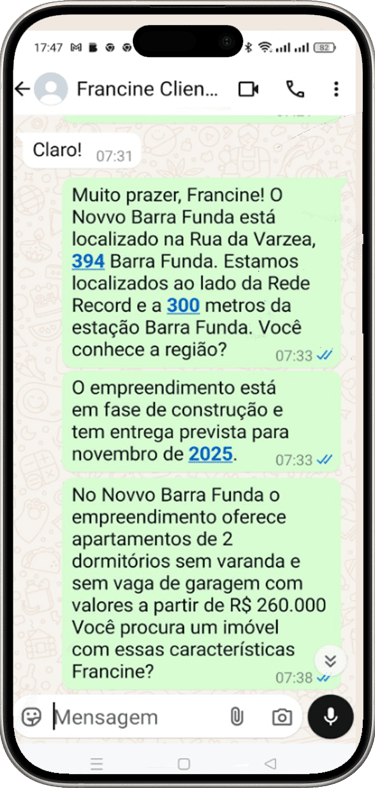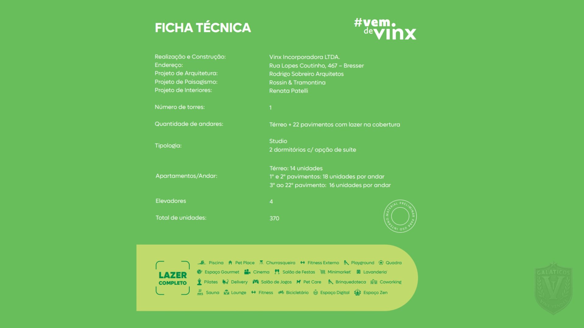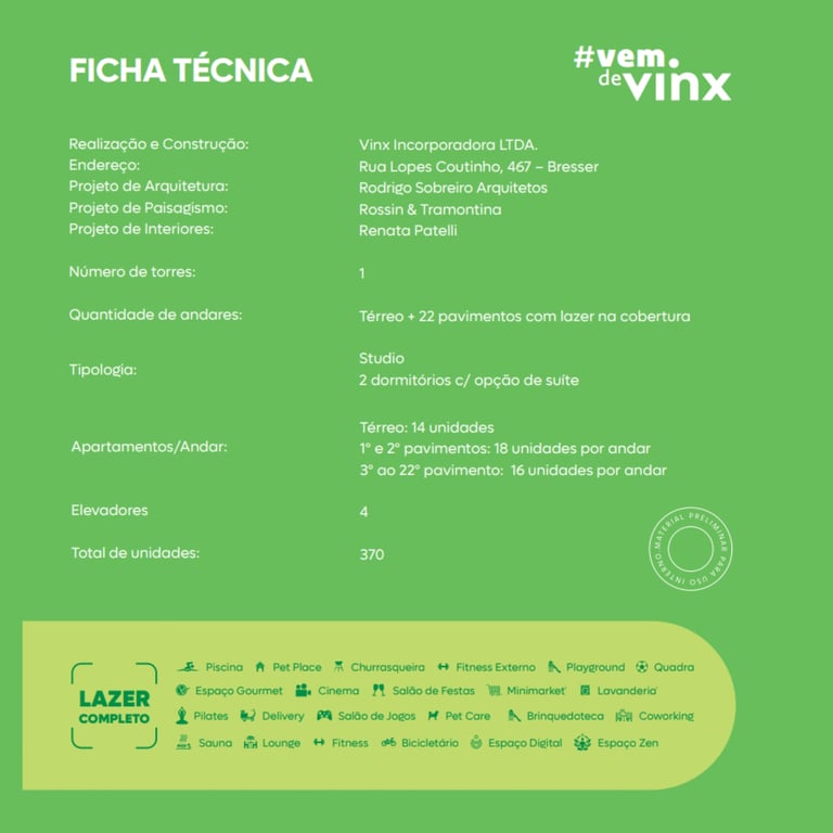 Consulte valores, data de entrega, imagens e condições de pagamento para o Vinx Bresser Mooca com nosso assistente virtual com inteligência artificial. Clique no botão abaixo e saiba mais!